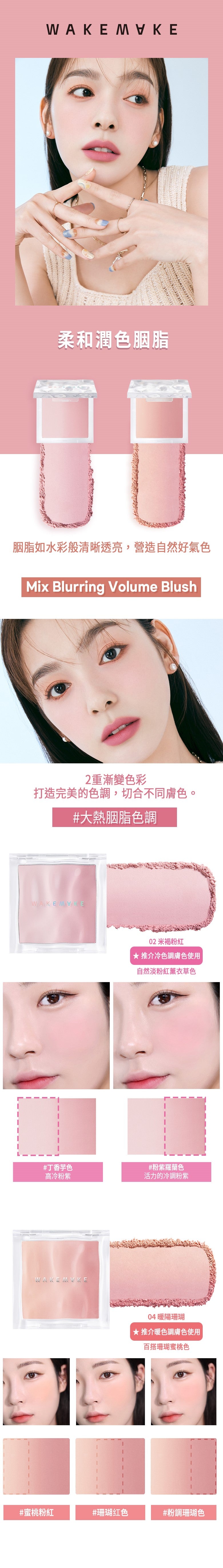 - 以手指或粉撲沾取適量胭脂,輕拍於臉頰,可單獨或混色使用