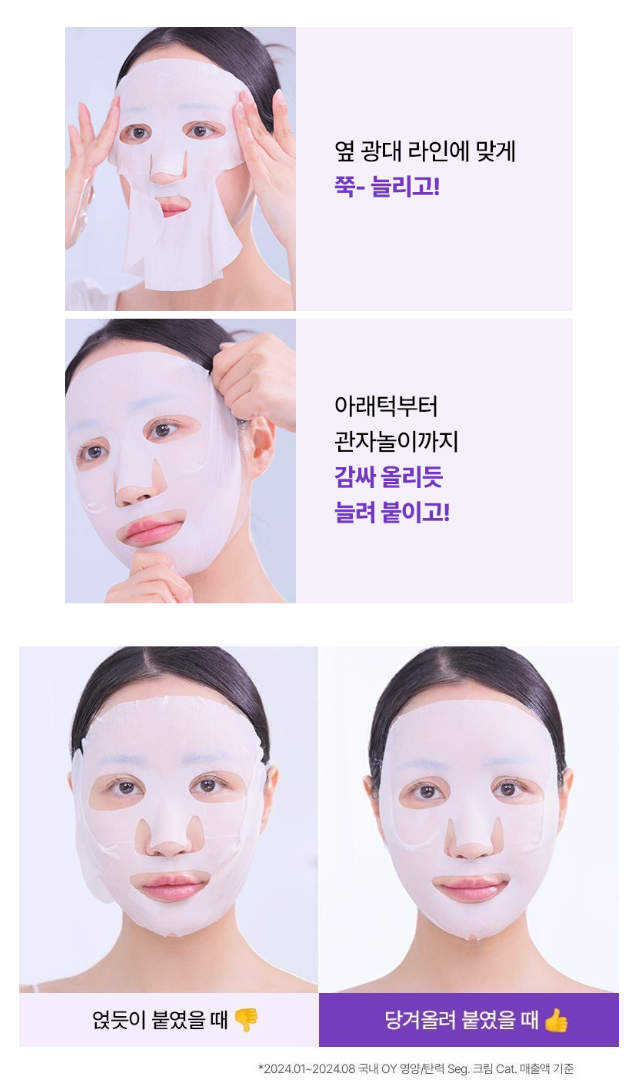- 爽膚後,面膜由面部中央對齊兩頰,從下往上提拉貼緊